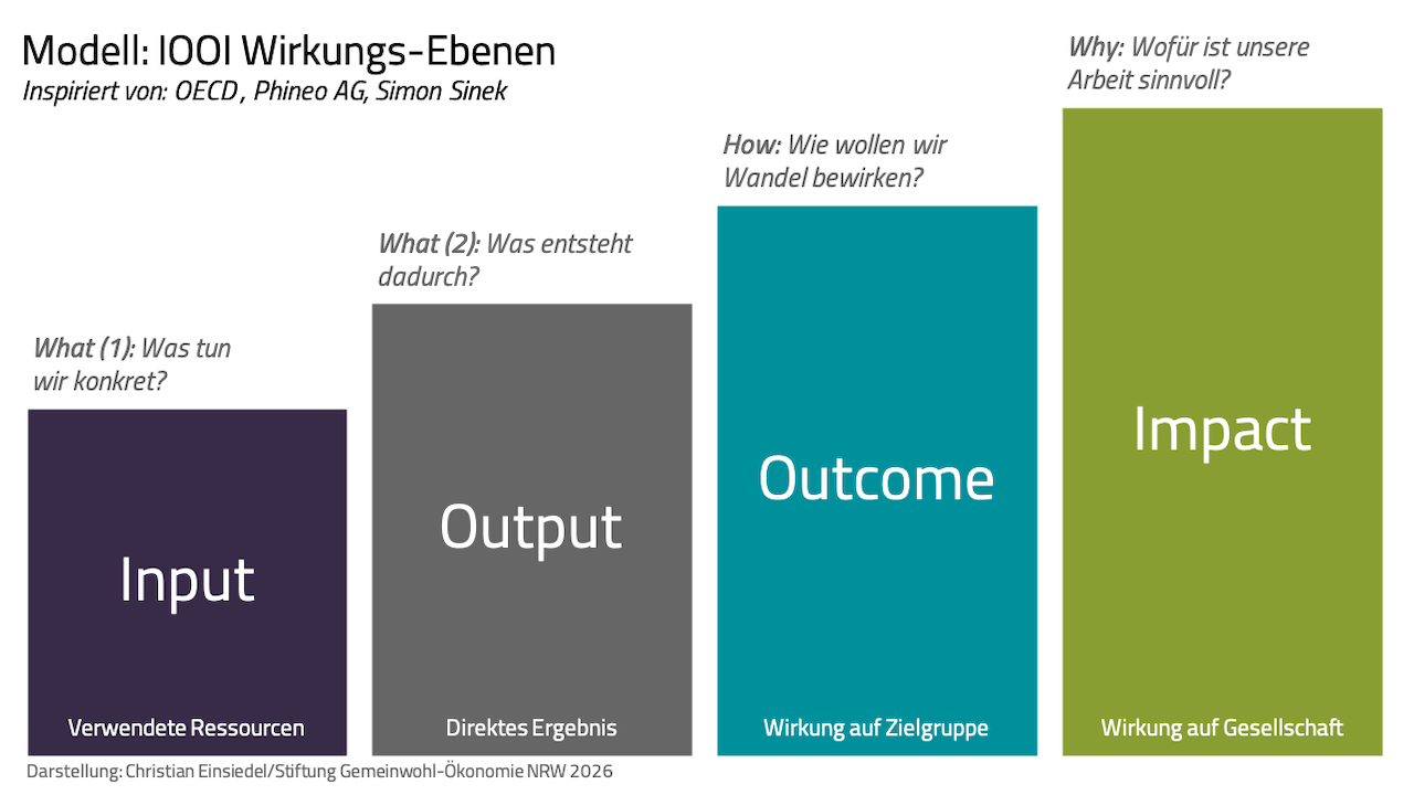 Er stellte auch das IOOI-Wirkungsmodell vor, mit dem wir Stiftungs-Projekte planen und auswerten. Aufbauend auf der Results Chain der OECD, der Wirkungstreppe der Phineo AG und Simon Sineks Golden Circle geht es dabei um vier Ebenen, auf denen Projekte wirksam werden:
